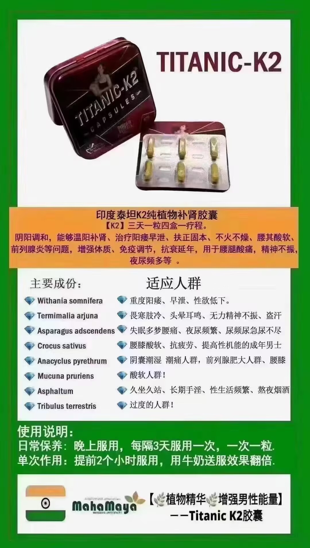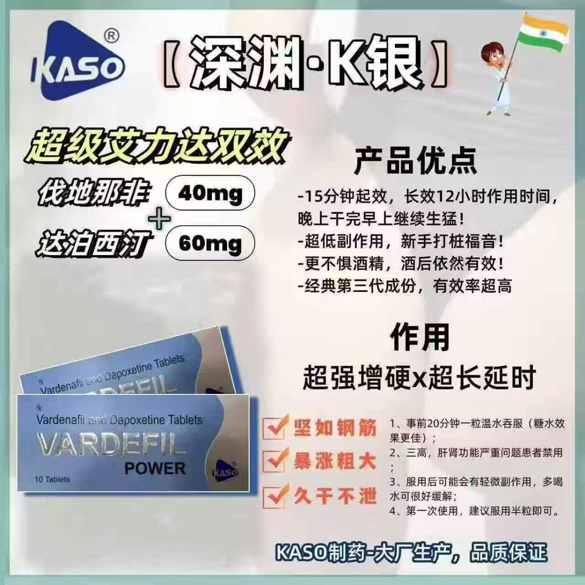 本店只做印度/泰国原装进口双效片,价格是国内的5分之一左右,是国内任何药厂出的男性用药所比不了的,(而且没有任何的依赖性和副作用)!印度从2010年左右就已经是世界上男性用药生产最大的地区,本店从2018年开始代购,请大家尽管放心。